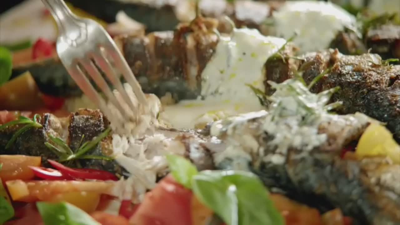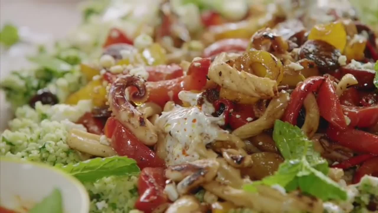 Средиземноморский гуляш из рыбы с чесночным хлебом и азиатский салат с обжаренной пряной говядиной